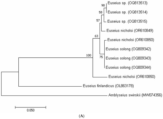 | Putative Euseius sp. (OQ799396) | Putative Euseius sp. (OQ799397) | Putative Euseius sp. (OQ799398) | E. oolong (OQ780361) | E. oolong (OQ780362) | E. oolong (OQ780363) | E. nicholsi (PRJNA1022847) | E. nicholsi (OR614377) | E. nicholsi (OR614378) | E. finlandicus (FJ404578) | Amblyseius swirskii (KX064694) | |