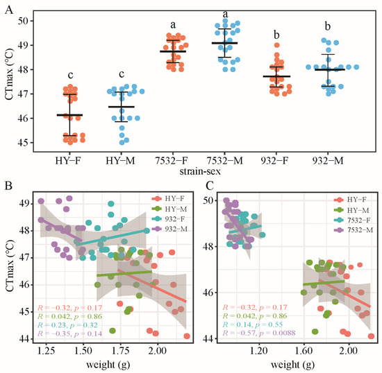 The results indicated that the average CTmax values for the two thermotolerant strains ranged from 47.72 ± 0.59 °C to 49.09 ± 0.67 °C (Figure 1A), significantly higher than that of the sensitive strain HY. We also analyzed the relationship between CTmax and individual weight (Figure 1B,C), finding no significant correlation, except in the males of strain 7532.