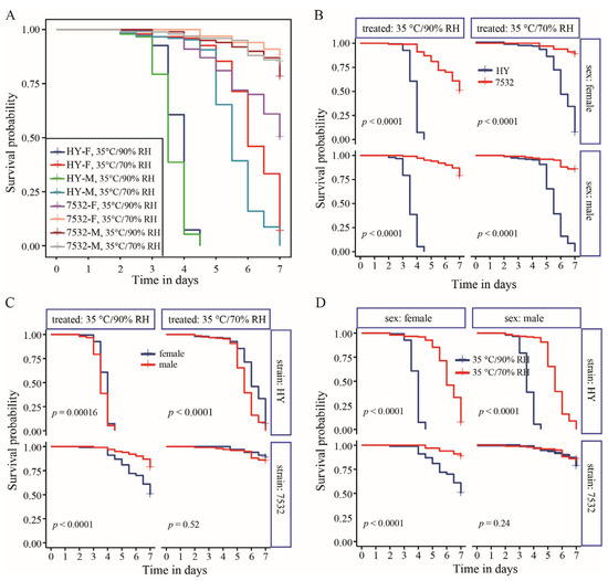 Figure 2. Survival probability between the resistant strain 7532 and sensitive strain Haoyue under high temperature and humidity treatment. (A) Summary of all the survival curves. The curves were fitted using the Kaplan–Meier method of the Survfit function in the Survival package. The x-axis represents the number of treatment days for the fifth instar larvae. (B) Differences in survival probability between 7532 and Haoyue (HY). The p-values were computed using the log-rank test. (C) Comparison of the survival probability between males and females. (D) Survival probability under two treated conditions.