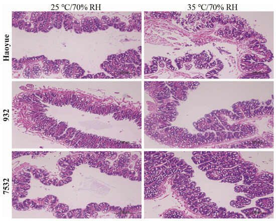 It was indicated that the thermotolerant strains showed higher survival probabilities than those of the sensitive strain regardless of the treatment conditions or sex (Figure 2B and Figure S1B). Under high temperature conditions, high humidity significantly increased mortality rates for both thermotolerant and sensitive strains, except for males of the 7532 strain (Figure 2D and Figure S1D). However, comparing the mortality rates at 25 °C/90% RH with those at 25 °C/70% RH revealed that the higher humidity (90% RH) did not lead to a significant increase in mortality. After acute heat stress at 35 °C and 70% RH for 24 h, midgut sections stained with H&E showed significant cell sloughing into the lumen of the sensitive HY larvae (Figure 3). A similar occurrence has been reported in the midgut of honey bees subjected to 45 °C for 4 h [42]. In contrast, no sloughing of midgut cells was observed in the two resistant strains.