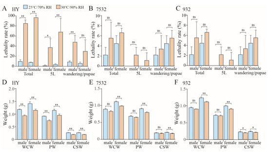 Figure 4. Effects of moderate-high temperature and high humidity on yield traits and lethality rate. (AC) Comparison of lethality in the silkworms after moderate-high temperature and high humidity. The fifth instar larvae (5L) were kept at 30 °C/90% RH and then kept under 25 °C/70% RH during the wandering and pupal stages. Lethality rates were counted at 5L and wandering/pupal stages, respectively. (DF) Effects on cocoon and silk production in Haoyue (HY), 7532 and 932. Whole cocoon weight (WCW), pupal weight (PW), and cocoon shell weight (CSW) were investigated on day 5 of the pupal stage. The graph shows the average yield data for each individual. * p < 0.05; ** p < 0.01; ns: not significant.
