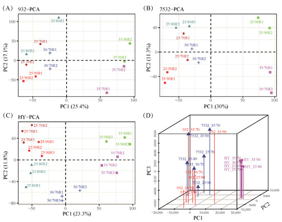 Figure 5. Principal component analysis of all the transcriptomic samples. (AC) PCA analysis of the 932, 7532, and Haoyue. R1, R2, and R3 represent the sample replicates. The 25/70, 25/80, 25/90, 30/70, 35/70, and 35/90 represent the treatment conditions 25 °C/70% RH, 25 °C/80% RH, 25 °C/90% RH, 30 °C/70% RH, 35 °C/70% RH, and 35 °C/90% RH. (D) Three-dimensional (3D) principal component analysis. The average FPKM values of each sample were used for 3D plotting with the scatterplot3d package in R v4.1.3.