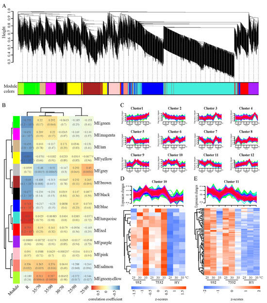 Figure 6. Co-expression analysis for differentially expressed genes after temperature and humidity exposure. (A) Cluster dendrogram of the co-expression network modules. Each vertical line represents a single gene. The y-axis represents the value of the distance measurement between clusters. The module below corresponds to the height above, i.e., different heights correspond to different modules. (B) Correlation between modules and traits according to Pearson correlation. R represents the thermotolerance (resistance) trait. The p-values of Pearson correlation are shown in parentheses. (C) Soft clusters of all the DEGs respond to heat stress by Mfuzz software. Red and purple lines correspond to genes with high membership values. The numbers on the x-axis represent the treated temperatures, including 25 °C, 30 °C, and 35 °C. (D) Heatmap of the overlapping genes between cluster 10 and the significant related modules (MEblue, MEturquoise, and MEred) of the R trait. (E) Heatmap of the overlapping genes between cluster 11 and the significantly related modules of the R trait.