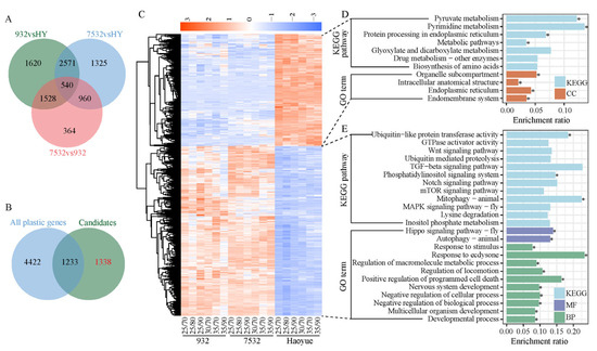 Figure 7. Identification and expression heatmap of the Evo_non-PG genes. (A) Venn diagram of the DEGs among the three strains under normal rearing conditions. In total, 2571 genes were the overlapping DEGs between the resistant and sensitive strains, which were the candidates for Evo_non-PG genes. HY: Haoyue. (B) Venn diagram between the candidates of Evo_non-PG genes and all the 5655 plastic response genes. (C) Expression heatmap of the 1338 Evo_non-PG genes. (D,E) Representatives of the enriched KEGG pathways and GO terms for the downregulated and upregulated Evo_non-PG genes in the resistant strains. CC: cellular component, BP: biological process, MF: molecular function. * FDR < 0.05.