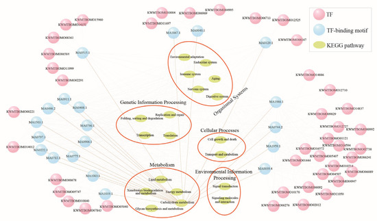 Figure 8. The predicted transcriptional regulatory network of the evolved non-plastic genes. The pink circles are transcription factors (TFs) of the Evo_non-PG genes. The blue circles represent the TF-binding motifs enriched at 2 kb upstream of all the protein-coding genes of the Evo_non-PG. The target genes of TFs were annotated to corresponding KEGG pathways using BlastKOALA (https://www.kegg.jp/blastkoala/, accessed on 25 October 2023).