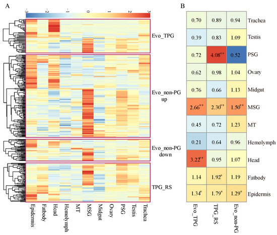 Figure 9. Tissue enrichment of the evolved and plastic response genes. (A) Heatmap of the expression levels for the tissue-enriched genes in various tissues on day 3 of the fifth instar larvae. MT: Malpighian tubule, MSG: middle silk gland, PSG: posterior silk gland. (B) Tissue enrichment of the evolved and plastic response genes. The colors and numbers denote the magnitude of the odds ratio. Each cell represents the result of a Fisher’s exact test. ** p < 0.01, * p < 0.05.