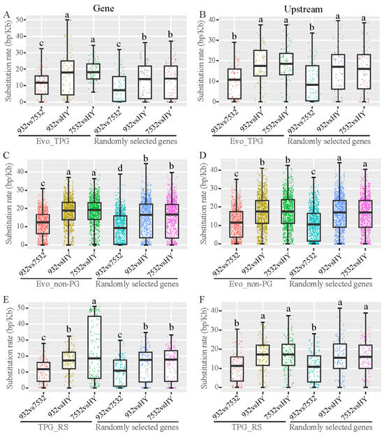 Figure 10. Nucleotide divergence of the evolved and plastic genes between the resistant and sensitive strains. HY: Haoyue. (A,B) Substitution rates of the gene region and 2 kb upstream of the Evo_TPG. Eighty-eight randomly selected genes were used for comparison. (C,D) Substitution rates of the gene region and 2 kb upstream of the Evo_non-PG. In total, 1338 randomly selected genes were used for comparison. (E,F) Substitution rates of the gene region and 2-kb. Multiple comparisons were detected by the post hoc test with Bonferroni corrections. The a, b and c indicate significant differences at p < 0.05.