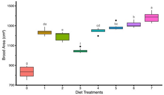 Effect of different artificial diets on brood area (cm2) of Apis mellifera. Values represent the mean brood area per diet ± standard error (SE). Different lowercase letters (a, b, c, etc.) indicate significant differences among treatments at 5% significance level (p < 0.05).