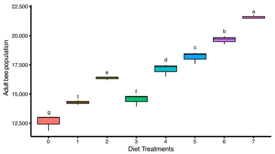Effect of different artificial diets on adult bee population of Apis mellifera. Values represent the mean population per treatment group (Diet) ± standard error (SE). Different lowercase letters (a, b, c, etc.) indicate significant differences among treatments at 5% significance level (p < 0.05).