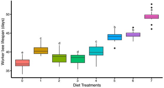 Effect of different artificial diets on worker bee lifespan of Apis mellifera. Values represent the mean longevity per treatment group (Diet) ± standard error (SE). Different lowercase letters (a, b, c, etc.) indicate significant differences among treatments at 5% significance level (p < 0.05).