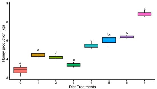 Effect of different artificial diets on honey production of Apis mellifera. Values represent the mean honey yield per treatment group (Diet) ± standard error (SE). Different lowercase letters (a, b, c, etc.) indicate significant differences among treatments at 5% significance level (p < 0.05).