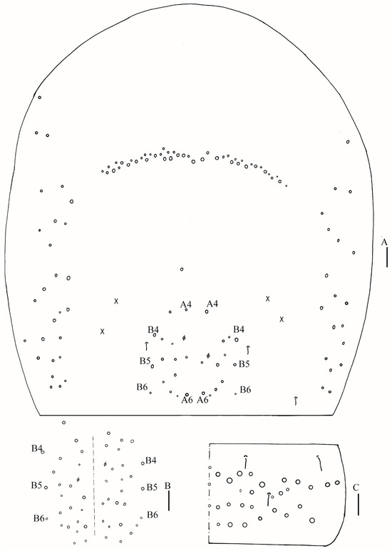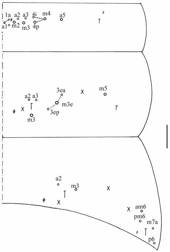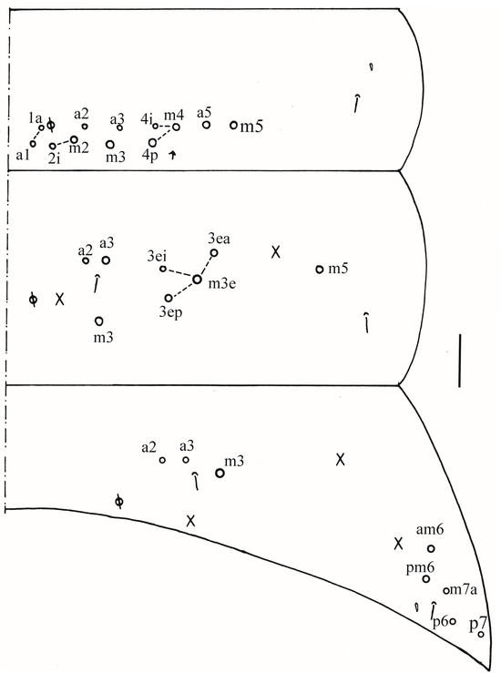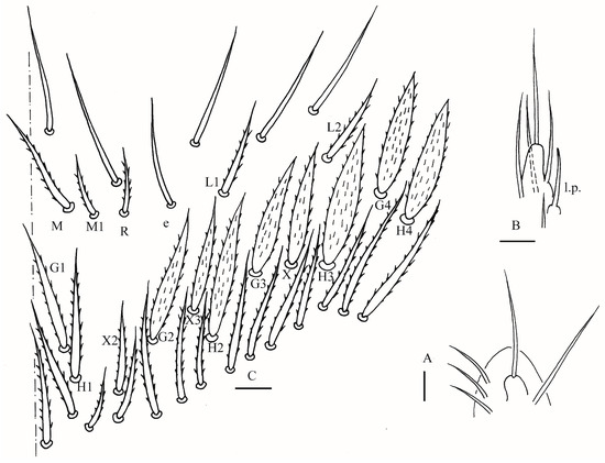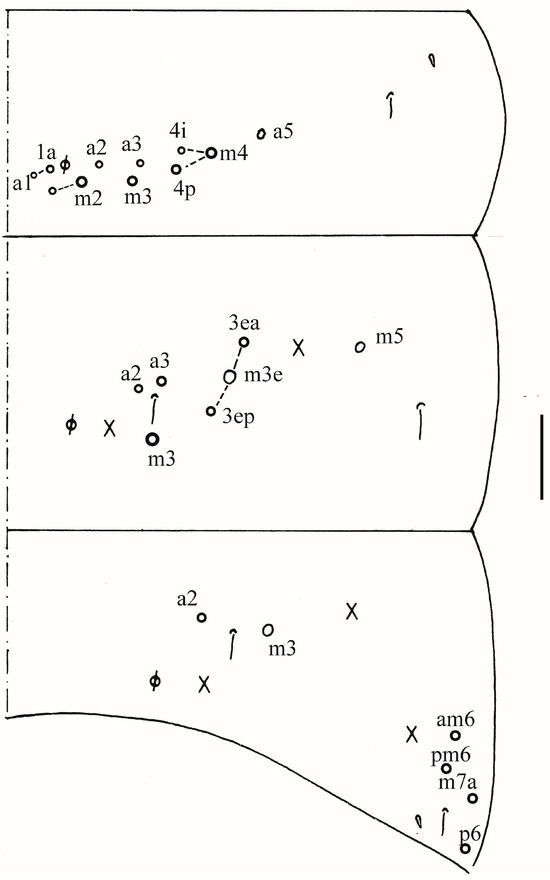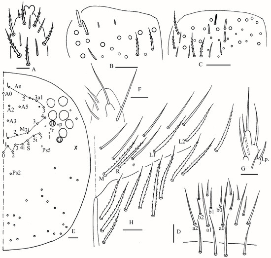 The nomenclature of the dorsal macrochaetotaxy of the head and interocular chaetae follows Jordana and Baquero (2005) and Mari-Mutt (1979, 1986) [5,6,7]. Labial chaetae are designated following Gisin (1964) [8]. Labral chaetae follows Szeptycki (1973) and trunk dorsal chaetotaxy follows Szeptycki (1979) [9,10].