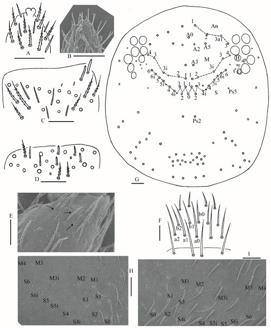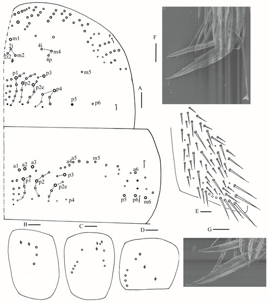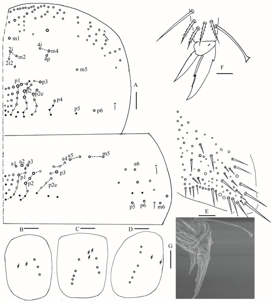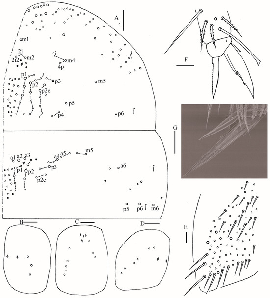 Thorax: Tergal ms formula on Th. II–Abd. V as 1, 0/1, 0, 1, 0, 0, sens as 2, 2/1, 2, 2, 2, 3 (Figure 3A, Figure 4 and Figure 5A,C). Th. II with 5–8 medio-medial (m1, m2, m2i, m2i2, 1–4 unnamed mac), three medio-sublateral (m4, m4i, m4p), 46–50 posterior mac. Th. III with 43–49 mac (Figure 3A). Coxal macrochaetal formula as 3/4 + 1, 3/4 + 2 (Figure 3B–D). Trochanteral organ with 86–111 smooth chaetae (Figure 3E). Tenent hair clavate, 0.86–1.00 length of inner edge of unguis; unguis with 3–4 inner teeth, basal pair located at 0.42–0.44 distance from base of inner edge of unguis, distal unpaired teeth at 0.67–0.68 and 0.85–0.86 distance from base, respectively, most distal one very faint and usually absent; unguiculus lanceolate, outer edge slightly serrate (Figure 3F,G).