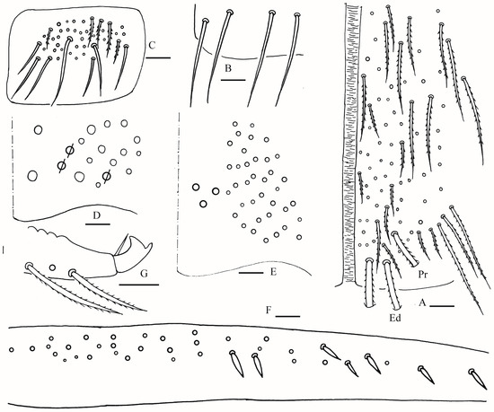 Abdomen: Range of Abd. IV length as 7.67–7.86 times as dorsal axial length of Abd. III. Abd. I with 11 (a1a, a1–3, m2i, m2–4, m4i, m4p and a5 mac). Abd. II with six (a2, a3, m3, m3e, m3ea, m3ep) central, one (m5) lateral mac. Abd. III with two (a2, m3) central, four (am6, pm6, m7a, p6) lateral mac (Figure 4). Abd. IV with two normal sens, 19–25 anterior, 13–25 posterior and 19–27 lateral mac or mes (Figure 5A,B). Abd. V with three sens (Figure 5C). Anterior face of ventral tube with 58–77 ciliate chaetae, 3+3 of them as mac, line connecting proximal (Pr) and external-distal (Ed) mac oblique to median furrow (Figure 6A); posterior face with 4–5 smooth chaetae apically (Figure 6B); lateral flap with 6–10 smooth and 26–33 ciliate chaetae (Figure 6C). Manubrial plate dorsally with 13–16 ciliate mac and three pseudopores (Figure 6D); ventrally with 39–48 ciliate chaetae on each side (Figure 6E). Dens with 37–63 smooth inner spines (Figure 6F). Mucro bidentate with subapical tooth larger than apical one; tip of basal spine reaching apex of subapical tooth; distal smooth section of dens almost equal to mucro in length (Figure 6G).