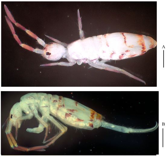Colour: Ground colour pale white; eye patches dark blue; Ant. II–IV and Abd. V brown; posterior margin of Abd. III and medial and posterior parts of Abd. IV with narrow transverse chrome to brown pigmented bands; little scattered brown or purple pigment present on tibiotarsi and lateral part of Th. II–Abd. II (Figure 7).
