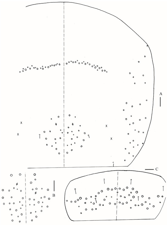 Homidia pseudochroma sp. nov. (A) chaetotaxy of Abd. IV (right side); (B) central chaetotaxy of Abd. IV posteriorly; (C) chaetotaxy of Abd. V. Scale bars: (A,B) 50 μm; (C) 20 μm.