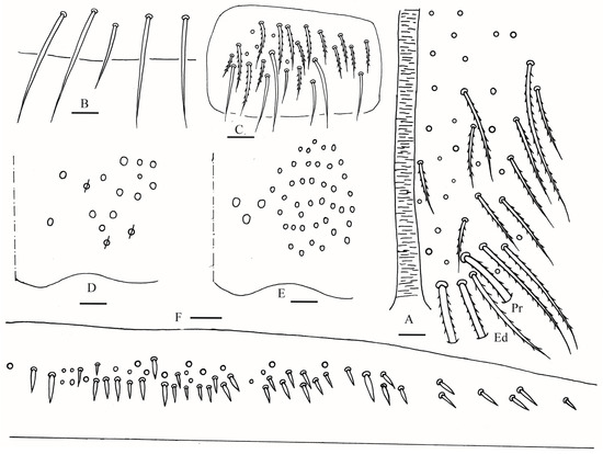 Abdomen: Range of Abd. IV length as 8.26–10.8 times as dorsal axial length of Abd. III. Abd. I with 12 (a1a, a1–3, m2i, m2–5, m4i, m4p, a5) mac. Abd. II with seven (a2, a3, m3, m3e, m3ea, m3ep, me3i) central, one (m5) lateral mac. Abd. III with two (a2, m3) central, five (am6, pm6, m7a, p6, p7) lateral mac (Figure 11). Abd. IV with two normal sens, 21–22 anterior, 14–18 (rarely 23) posterior and 32–37 lateral mac or mes (Figure 12A,B). Abd. V with three sens (Figure 12C). Anterior face of ventral tube with 40–42 ciliate chaetae, 3+3 of them as mac, line connecting proximal (Pr) and external-distal (Ed) mac oblique to median furrow (Figure 13A); posterior face with 5–7 smooth chaetae apically (Figure 13B); lateral flap with about seven smooth and 20 ciliate chaetae (Figure 13C). Manubrial plate dorsally with 12–14 ciliate mac and three pseudopores (Figure 13D); ventrally with 38–42 ciliate chaetae on each side (Figure 13E). Dens with 46–58 smooth inner spines (Figure 13F). Mucro bidentate with subapical tooth larger than apical one; tip of basal spine reaching apex of subapical tooth; distal smooth section of dens almost equal to mucro in length.