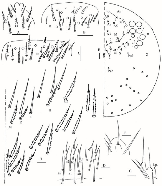 Head: Antenna not annulated and 1.05–1.10 times length of body. Ratio of Ant. I–IV as 1.00/1.25–1.29/1.00–1.10/2.00. Distal part of Ant. IV with many sensory chaetae and normal ciliate chaetae, apical bulb bilobed (Figure 2A). Ant. III sense organ with two rods, two spiny guard sensilla, smooth blunt sens and ciliated chaetae (Figure 2B). Ant. II with 3–4 rods apically (Figure 2C). Prelabral and labral chaetae as 4/5, 5, 4, all smooth, a2 and b2 slightly shorter than middle ones, labral papillae not clearly seen (Figure 2D). Eyes 8 + 8, G and H smaller than others, interocular chaetae as p, r, t mes. Dorsal chaetotaxy of head with 5–6 antennal (An), five median (M) and eight sutural (S) mac (Figure 2E). Basal chaeta on maxillary outer lobe slightly thicker than apical one; sublobal plate with three smooth chaetae-like processes (Figure 2F). Lateral process (l. p.) of labial palp E differentiated with tip not reaching apex of papilla E (Figure 2G). Labial base with MReL1L2, e smooth, other ciliate, R 0.60–0.79 length of M (Figure 2H).