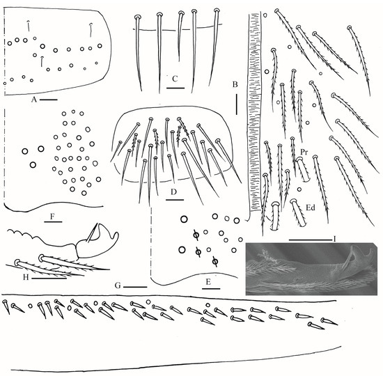 Homidia pseudochroma sp. nov. (A) apex of Ant. IV (dorsal view); (B) SEM photomicrograph of apex of Ant. IV (lateral view); (C) distal Ant. III (ventral view); (D) distal Ant. II (ventral view); (E) SEM photomicrograph of distal Ant. II (lateral view, black arrows showing rods); (F) prelabrum and labrum; (G) dorsal head; (H,I) SEM photomicrograph of dorsal head partially ((H) right side; (I) left side); Scale bars: 20 μm.