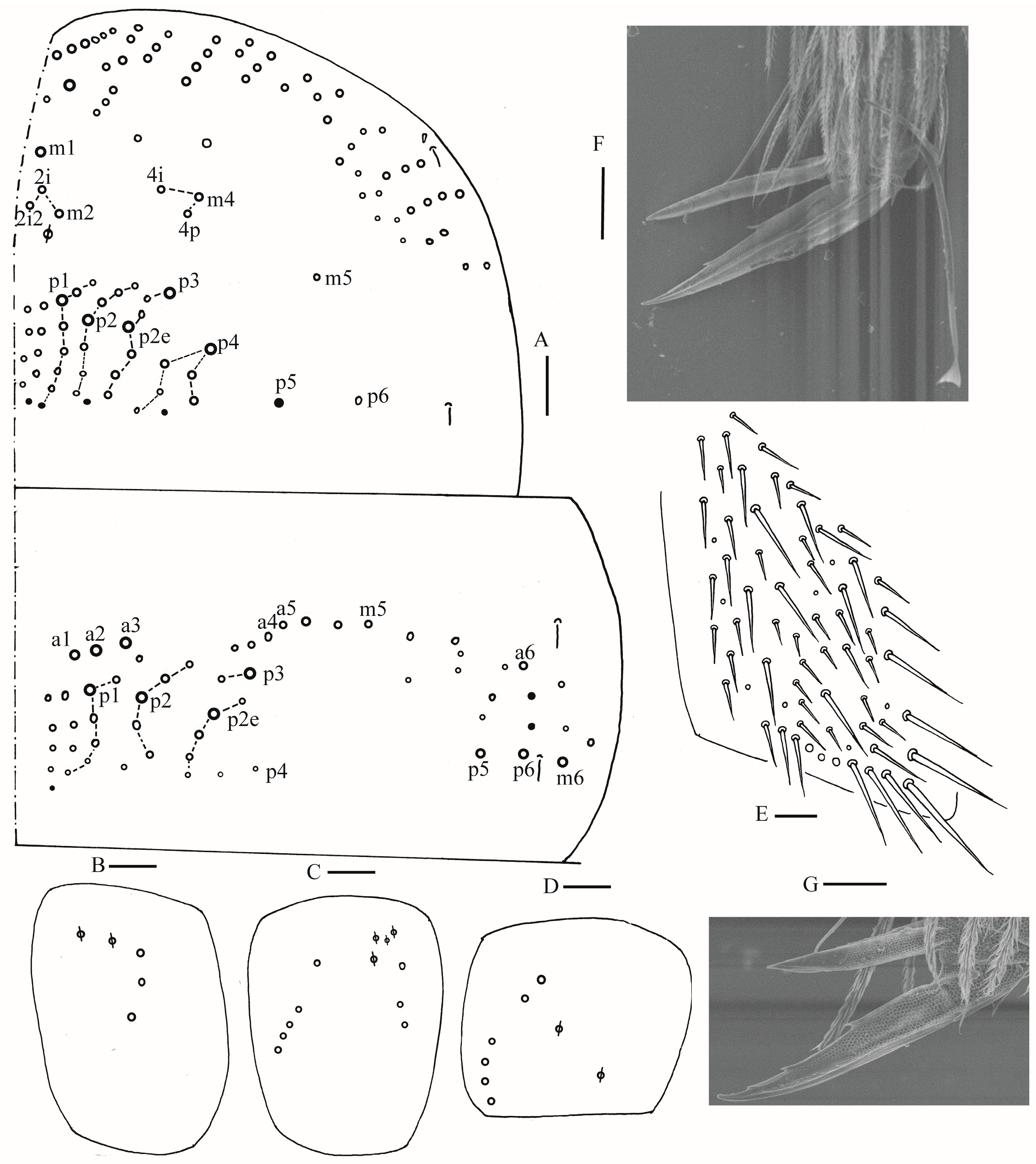 Dorsal chaetotaxy of head | 7 An, 5 M, 9 S mac | 5 An, 4 M, 9 S mac |