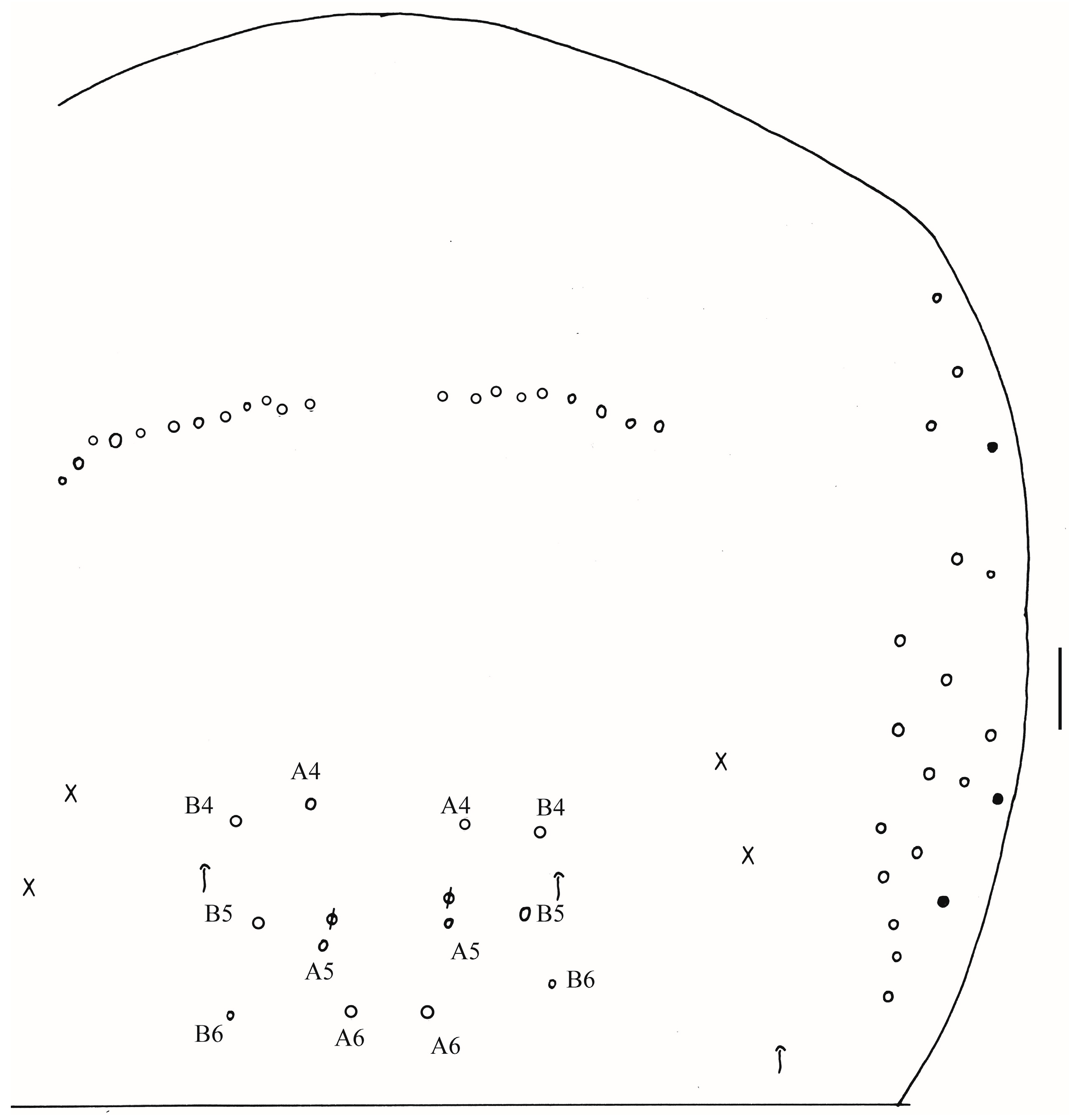 Central mac on Abd. IV posteriorly | 6 | 4 (5) | 3 |