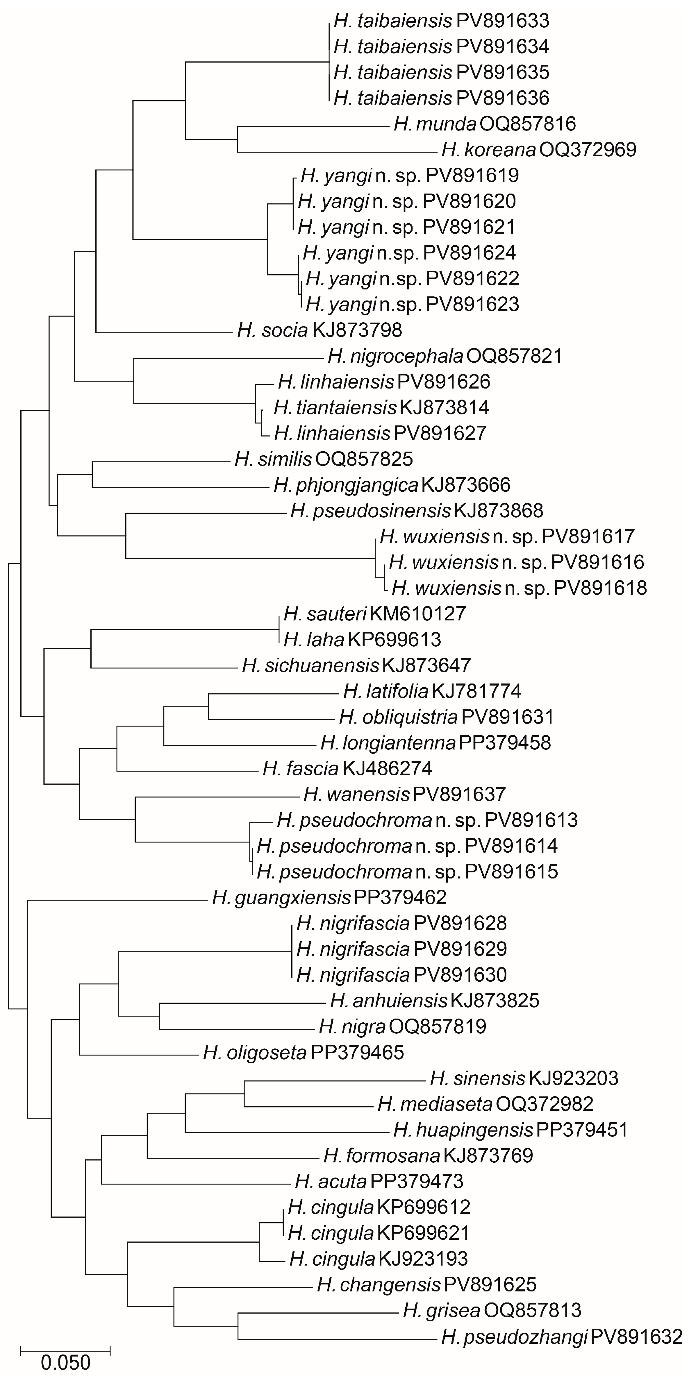 H. anhuiensis Li & Chen, 1997 | H. guangxiensis Zhou, Huang & Ma, 2024 | H. hjesanica Szeptycki, 1973 | H. sauteri (Börner, 1909) |