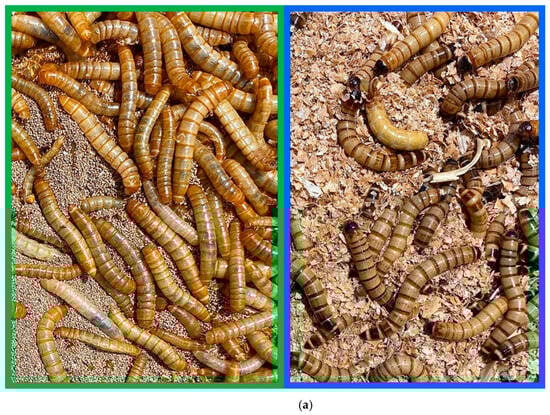 As a reaction to rising interest in using insects as food, some species from orders Coleoptera and Orthoptera were added to the European Union’s novel food list. One of them, T. molitor, or the yellow mealworm, used to be solely viewed as a storage pest and pet feed. In 2021, T. molitor larvae were marked as safe for consumption by the EU [5]. Recently, foodstuffs containing T. molitor larvae have entered the European food market, with the aim of increasing the protein content in products while utilizing a promising alternative protein source. Dried larvae are sold as whole in different flavors, as well as in the form of meal incorporated in pastry, chocolate, porridge, or snack bars. Raising T. molitor as a protein source is attractive due to lower space requirements, easy maintenance, high yield, and relatively low price [6].