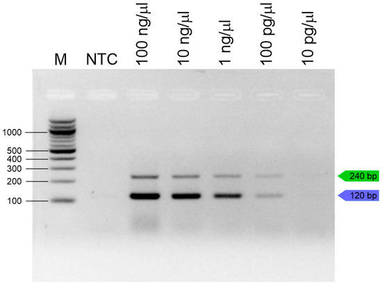 To determine the sensitivity of the singleplex and duplex PCR assays, DNA isolated from crushed T. molitor and Z. morio samples was used. Singleplex and duplex PCR were performed using 100 ng–1 pg of DNA as a template and the T. molitor and Z. morio primers. A DNA concentration of 100 pg was determined as the limit of detection for both singleplex and duplex PCR (Figure 2).