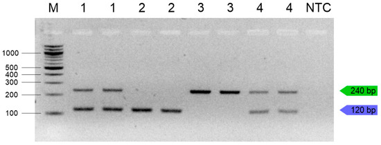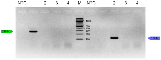In duplex PCR, no cross-reactions were observed, and sequencing PCR products showed 100% similarity to T. molitor and Z. morio sequences in the GenBank database and confirmed the specificity of the primers. Singleplex and duplex PCR accurately and specifically detected insect DNA from the target species. In accordance with EU Regulation 2015/2283, G. assimilis, L. migratoria, T. molitor, and Z. morio were selected for specificity testing. Singleplex PCR resulted in a single 240 bp amplicon for T. molitor and a single 120 bp amplicon for Z. morio (Figure 3).