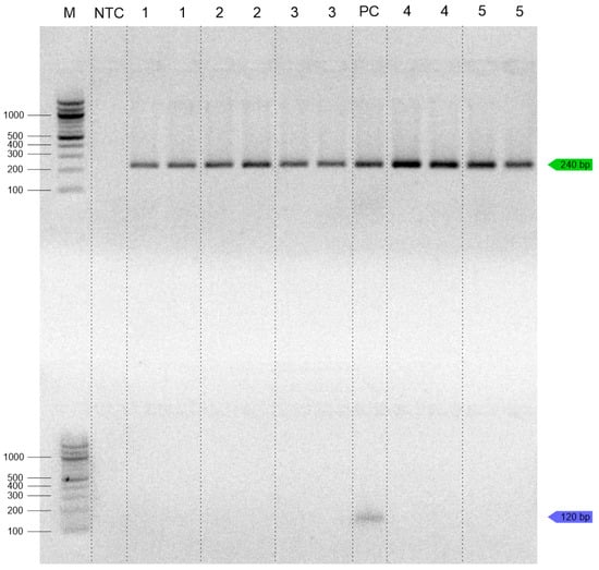 Products with T. molitor. 1—prepared boiled instant rice porridge (Farmerio, Svatoňovice, Czech Republic); 2—raw instant rice porridge (Farmerio, Svatoňovice, Czech Republic); 3—low-carb chocolate (Farmerio, Svatoňovice, Czech Republic); 4—dried larvae, “Křupaví červíci” (WormUP, Blansko, Czech Republic) with garlic; 5—dried larvae, “Křupaví červíci” (WormUP, Blansko, Czech Republic), with chili; M—100 bp ladder (NEB, UK); PC—10 ng/µL T. molitor (up) and Z. morio (down); NTC—no-template control; up (green)—PCR for detection T. molitor; down (blue)—PCR for detection Z. morio.