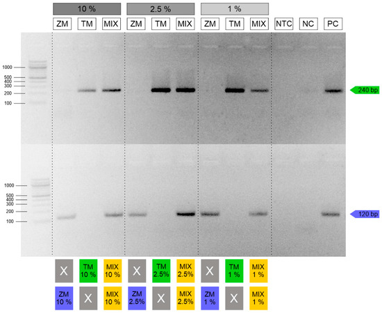 Pastry samples. Up (green) TM—PCR for detection T. molitor; down (blue) ZM—PCR for detection Z. morio; MIX (yellow)—T. molitor and Z. morio; PC—10 ng/µL T. molitor (up) and Z. morio (down); NTC—no-template control; X—not detected.