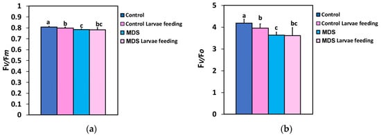 The maximum efficiency of PSII photochemistry (Fv/Fm) (a), and the efficiency of the oxygen-evolving complex (Fv/Fo) (b) before and after 20 min of larvae feeding, in well-watered (WW, control) or mildly drought-stressed (MDS) tomatoes. Standard deviations (SD) are shown by bars. Different lower-case letters reveal significant differences at p < 0.05 (n = 6).