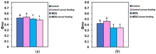 The effective quantum yield of PSII photochemistry (ΦPSII) at actinic light (AL) of 250 μmol photons m−2 s−1, corresponding to the growth light intensity (GLI) (a), and at actinic light (AL) of 1000 μmol photons m−2 s−1, corresponding to a high light intensity (HLI) (b), measured before and after 20 min of larvae feeding, in well-watered (WW, control) or mildly drought-stressed (MDS) tomatoes. Standard deviations (SD) are shown by bars. Different lower-case letters reveal significant differences at p < 0.05 (n = 6).