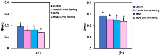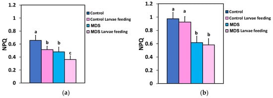 The non-photochemical quenching (NPQ) at 250 μmol photons m−2 s−1 AL (a) and at 1000 μmol photons m−2 s−1 AL (b), before and after 20 min of larvae feeding, in well-watered (WW, control) or mildly drought-stressed (MDS) tomatoes. Standard deviations (SD) are shown by bars. Different lower-case letters reveal significant differences at p < 0.05 (n = 6).