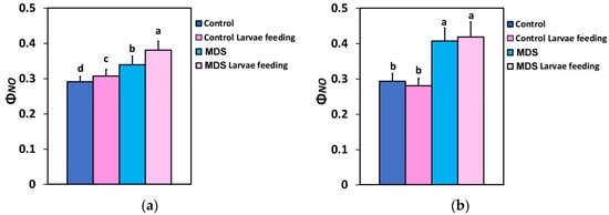 The quantum yield of non-regulated energy loss in PSII (ΦNO) at the GLI increased after larvae feeding, compared to controls (Figure 4a), but remained at the level of the controls at HLI (Figure 4b). ΦNO increased by MDS at both light intensities (Figure 4a,b), but ΦNO after larvae feeding in MDS tomatoes increased further only at the GLI (Figure 4a). At the HLI ΦNO after larvae feeding in MDS tomatoes was maintained at the pre-feeding level (Figure 4b). Thus, larvae feeding increased ΦNO in both WW and MDS tomatoes only under the low light intensity that corresponded to the GLI.