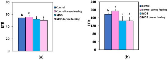 The electron transport rate (ETR) at 250 μmol photons m−2 s−1 AL (a) and at 1000 μmol photons m−2 s−1 AL (b), before and after 20 min of larvae feeding, in well-watered (WW, control) or mildly drought-stressed (MDS) tomatoes. Standard deviations (SD) are shown by bars. Different lower-case letters reveal significant differences at p < 0.05 (n = 6).