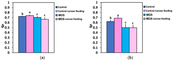 The portion of open PSII rection centers (RCs) (qp) that reveal the redox state of quinone A (QA), at 250 μmol photons m−2 s−1 AL (a) and at 1000 μmol photons m−2 s−1 AL (b), before and after 20 min of larvae feeding, in well-watered (WW, control) or mildly drought-stressed (MDS) tomatoes. Standard deviations (SD) are shown by bars. Different lower-case letters reveal significant differences at p < 0.05 (n = 6).