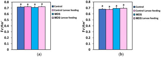 The efficiency of the open PSII RCs (Fv′/Fm′) at 250 μmol photons m−2 s−1 AL (a) and at 1000 μmol photons m−2 s−1 AL (b), before and after 20 min of larvae feeding, in well-watered (WW, control) or mildly drought-stressed (MDS) tomatoes. Standard deviations (SD) are shown by bars. Different lower-case letters reveal significant differences at p < 0.05 (n = 6).