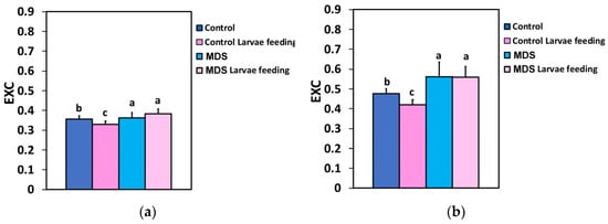 The excess excitation energy (EXC), at both the GLI and the HLI, decreased after 20 min of larvae feeding in well-watered tomatoes, while drought stress increased EXC compared to controls. The larvae feeding had no effect on EXC, compared to drought-stressed tomatoes before feeding, at both the GLI and the HLI (Figure 9a,b).