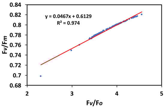 The patterns of the maximum efficiency of photosystem II photochemistry (Fv/Fm) and of the efficiency of the oxygen-evolving complex (Fv/Fo) were closely related (Figure 1a,b), as it was documented by the significant positive correlation that they showed in the regression analysis (R2 = 0.974, p < 0.001) (Figure 11).
