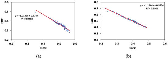 A significant negative correlation was found between the excess excitation energy at PSII (EXC) and the quantum yield of PSII photochemistry (ΦPSII) (Figure 12a,b). A decreased ΦPSII was corelated with an increased excess excitation energy at both the GLI (R2 = 0.9492, p < 0.001, Figure 12a) and the HLI (R2 = 0.9906, p < 0.001, Figure 12b).
