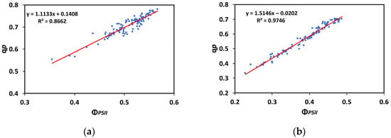 A significant positive correlation between the redox state of quinone A (QA), representing the portion of the open PSII reaction centers (qp), and the effective quantum yield of PSII photochemistry (ΦPSII), at both the GLI (R2 = 0.8662, p < 0.001, Figure 13a) and the HLI (R2 = 0.9746, p < 0.001, Figure 13b), was discovered, suggesting that the efficiency of the excitation energy capture by the open PSII reaction centers (Fv′/Fm′) was not significantly influenced by the treatments and had a negligible impact on the increase or decrease in the quantum yield of PSII photochemistry.