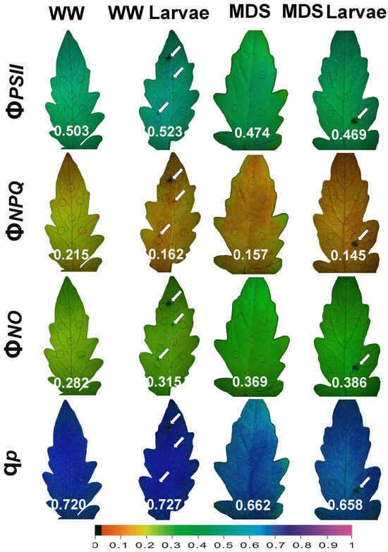 Representative color pictures of the whole area of the tomato leaves for the parameters ΦPSII, ΦNPQ, ΦNO, and qp (captured at the growth light intensity, GLI) of WW and MDS tomatoes, before and after 20 min of larvae feeding, are shown in Figure 14. After 20 min of larvae feeding, in WW tomatoes the effective quantum yield of PSII photochemistry (ΦPSII) increased at the whole-leaf level despite the decreased ΦPSII at the feeding areas (shown by white arrows in Figure 14). At the same time, the significantly decreased quantum yield of heat dissipation (ΦNPQ) resulted in increased values of the quantum yield of non-regulated energy loss in PSII (ΦNO), compared to before feeding. In MDS tomatoes, it decreased.