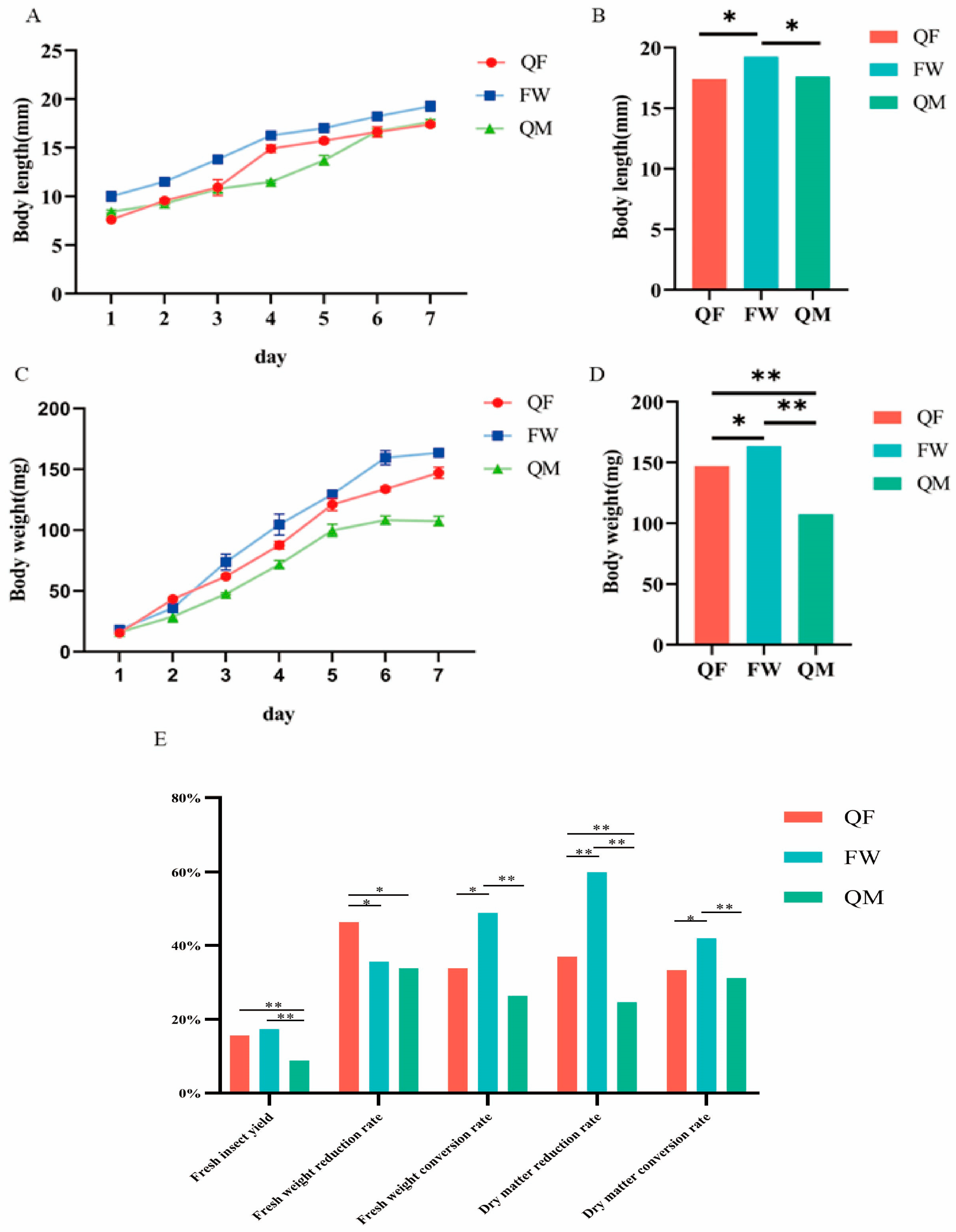 Figure 1. Effects of three different rearing substrates on the body length, body weight and production performance of BSFL. (A) The length of the insect body from day 1 to day 7. (B) The body length of BSFL on day 7 of collection. (C) The weight of the insect body from day 1 to day 7. (D) The body weight of BSFL on day 7 of collection. (E) Production performance. *—significant difference at p < 0.05; **—significant difference at p < 0.01.