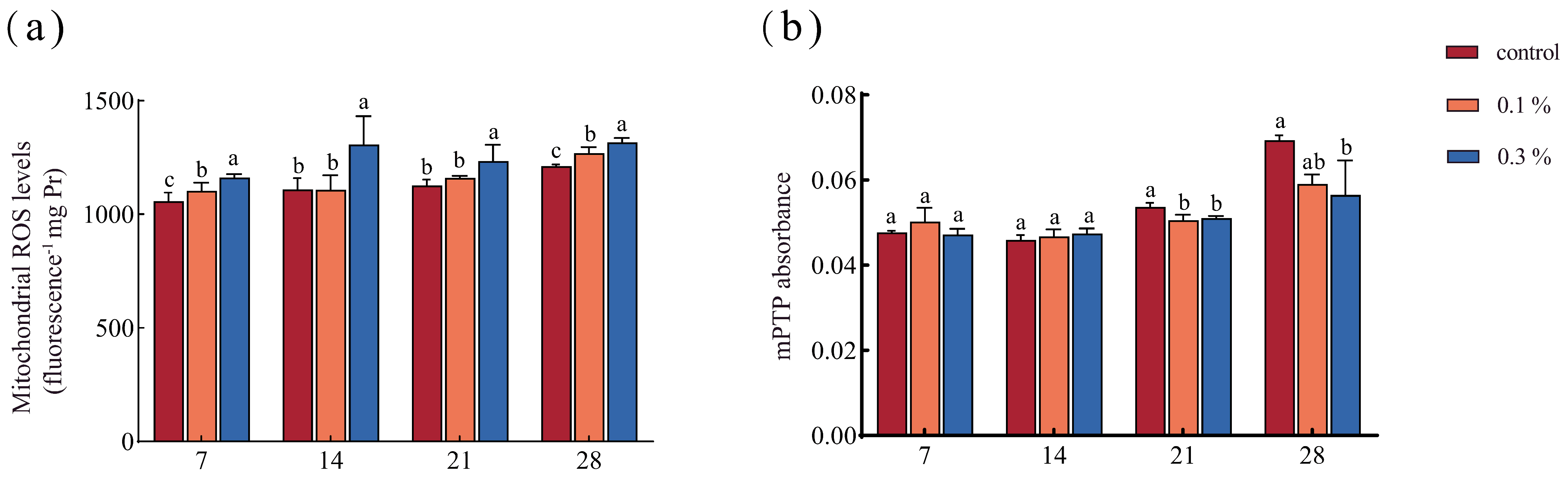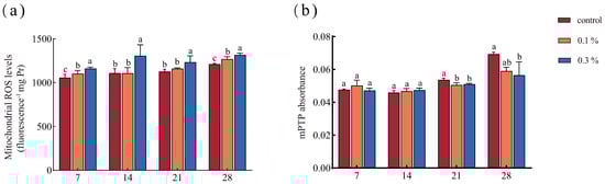 GO exposure induced significant time- and dose-dependent mitochondrial toxicity in the ants. By day 7, mitochondrial ROS had already accumulated in GO-exposed ants and were significantly higher than in the control. This trend persisted through days 14, 21, and 28 (Figure 1a). Mitochondrial membrane permeability was evaluated by monitoring mitochondrial permeability transition pore (mPTP) opening at 540 nm. By days 7 and 14, the absorbance of the mitochondria did not differ between control and GO-exposed ants. By day 21, absorbance was significantly lower in both the 0.1% and 0.3% groups than in the control, and by day 28, the 0.3% group showed an 18.46% decrease relative to the control, indicating increased mitochondrial permeability (Figure 1b).