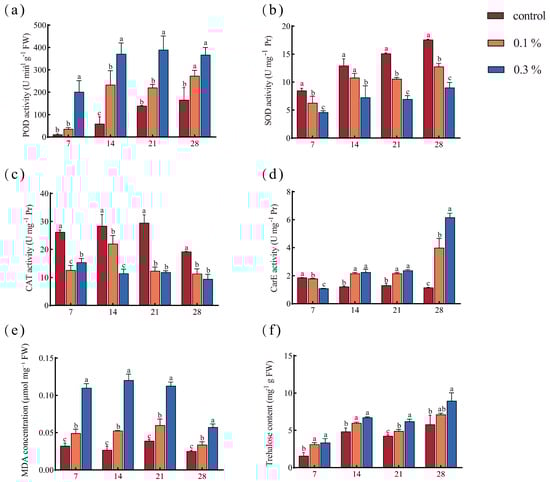 Antioxidant response of ants to GO exposure: (a) POD activity; (b) SOD activity; (c) CAT activity; (d) CarE activity; (e) MDA concentration; (f) trehalose content. Each bar represents the mean ± SD. Different letters above the error bars represent significant differences among treatments (p < 0.05) (n = 3).