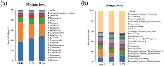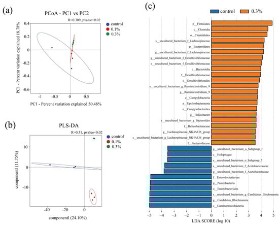 The raw reads were filtered with Trimmomatic v0.33, and primer adaptors were removed using cutadapt v1.9.1 [32,33]. The clean reads were merged based on overlap with USEARCH v10 [34]. Chimeric sequences were detected and removed with UCHIME v4.2. The obtained sequences were clustered into operational taxonomic units (OTUs) with 97% identity using USEARCH. Taxonomy was assigned to representative OTUs using the Naïve Bayesian classifier against the SILVA reference database. Alpha diversity indices (Chao1, ACE, Shannon, Simpson) were calculated using Mothur v1.30.2. Beta diversity was visualized using principal coordinates analysis (PCoA) and partial least squares–discriminant analysis (PLS-DA) based on Bray–Curtis dissimilarities. LEfSe (Linear discriminant analysis Effect Size) was performed to identify differentially abundant taxa between the control and 0.3% groups.