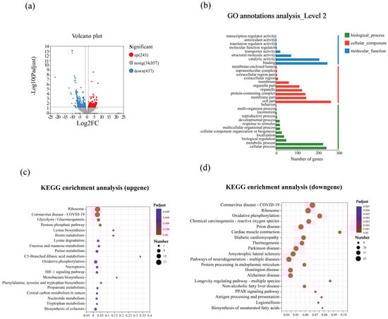 Effects of GO exposure on gene expression and functional analysis of DEGs in the ants after GO exposure. (a) Volcano plot showing the DEGs; (b) Gene Ontology annotation of the DEGs; (c) KEGG enrichment of upregulated genes; (d) KEGG enrichment of downregulated genes.