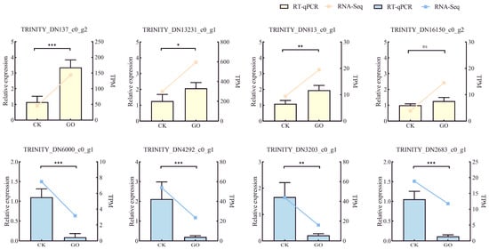 Verification of the relative expression levels of DEGs after GO treatments compared to the control. Error bars in the figure represent the mean ± SD. Notes: * p < 0.05, ** p < 0.01, *** p < 0 .001, ns: p > 0.05.