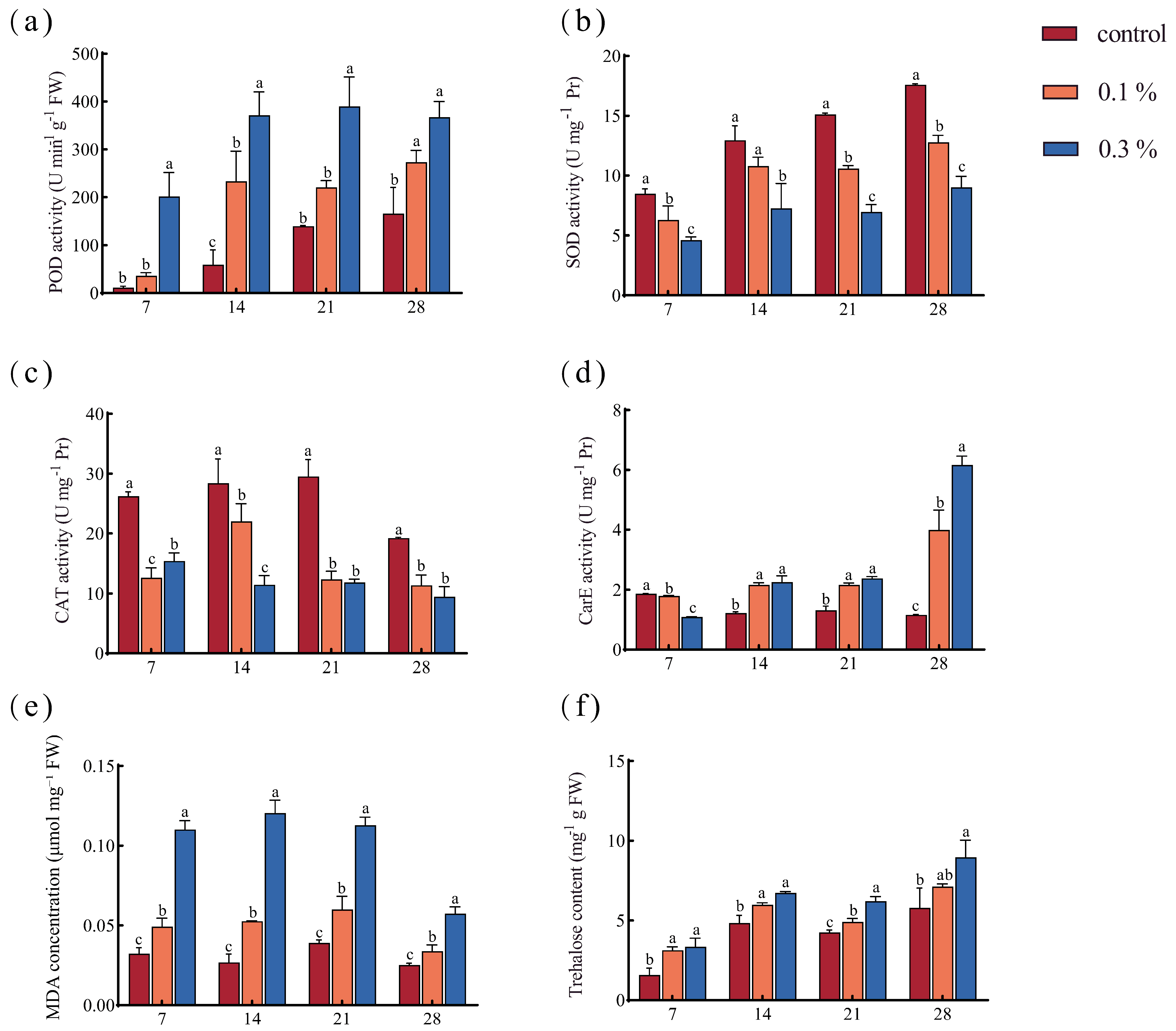 Commercial kits for CAT (A007-1-1) and CarE (A133-1-1) assays were obtained from Nanjing Jiancheng Bioengineering Institute (Nanjing, China). The activity was measured strictly following the kit instructions.